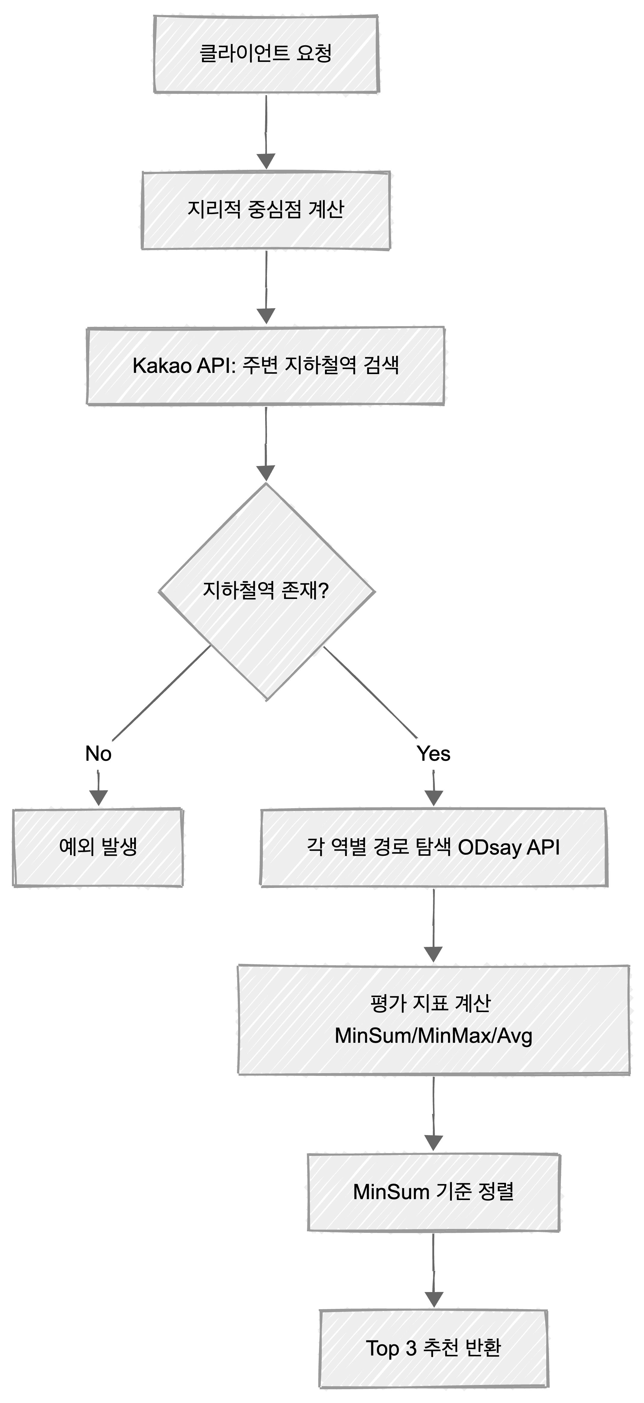 - 처리: 중심점 계산 → 근처 지하철역 5개 찾기 → 각 역까지 모두의 경로 탐색