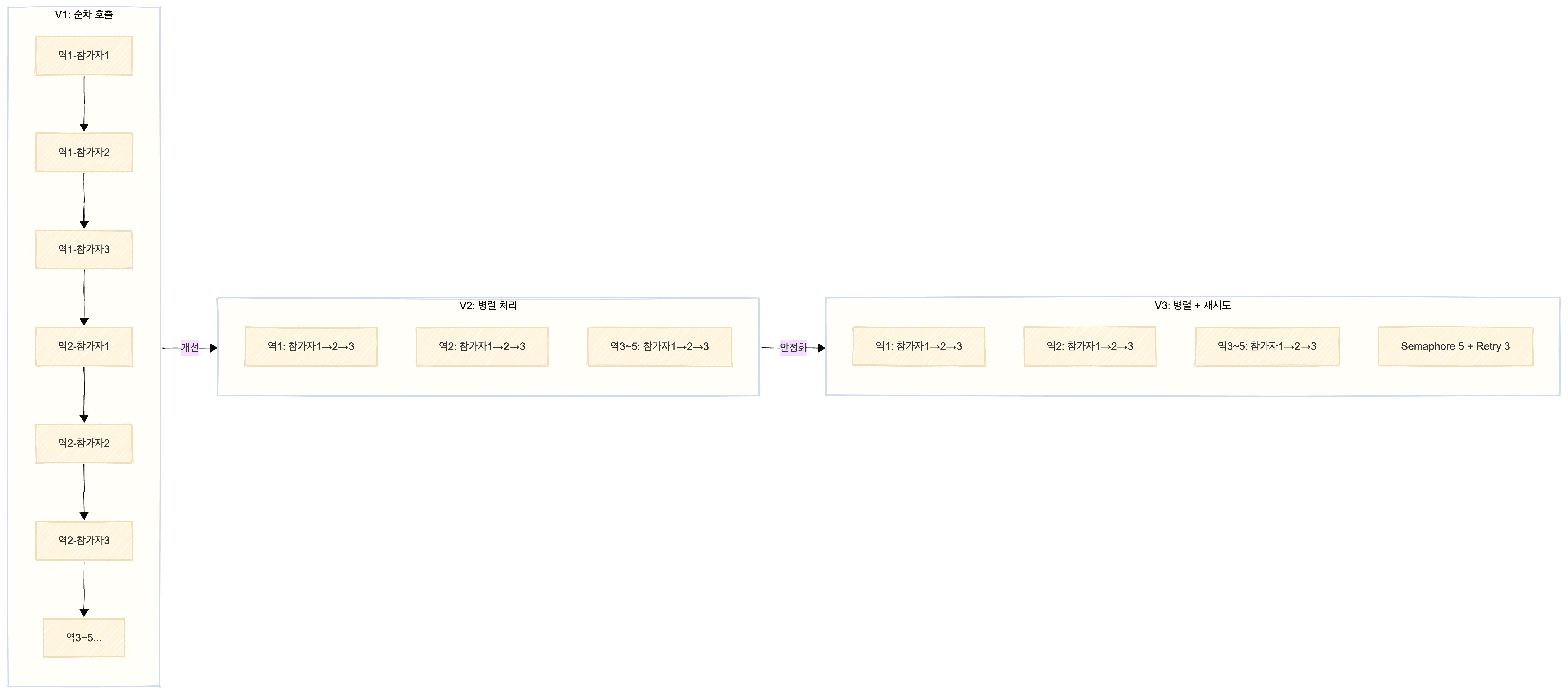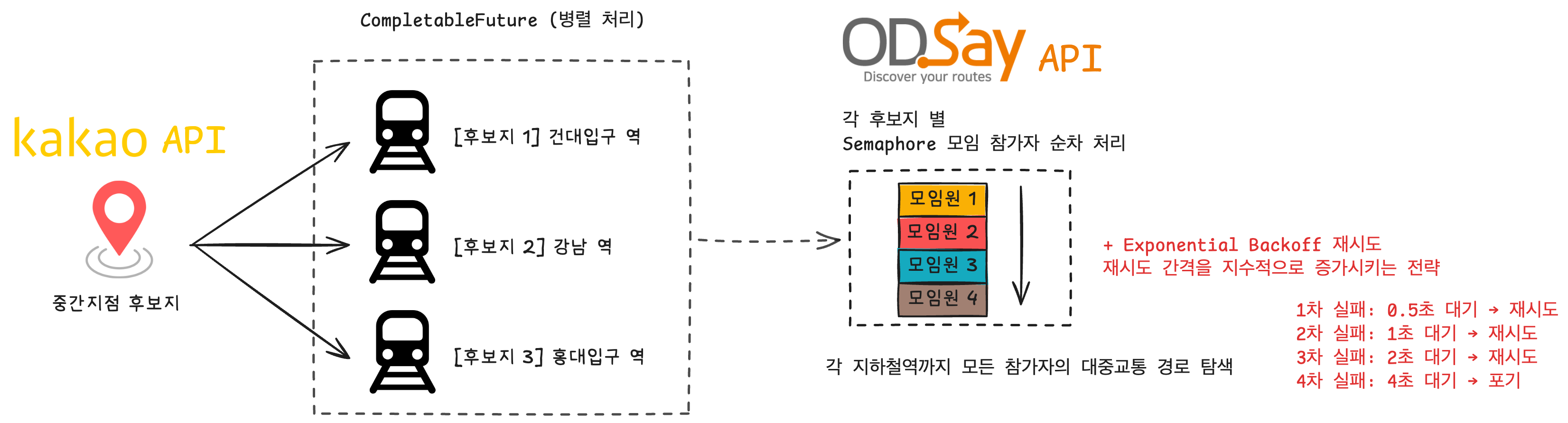 5개 역의 평가는 서로 영향을 주지 않기 때문에 병렬화할 수 있었습니다. 하지만 같은 역 내의 참가자별 호출은 API Rate Limit 때문에 순차로 유지했습니다.