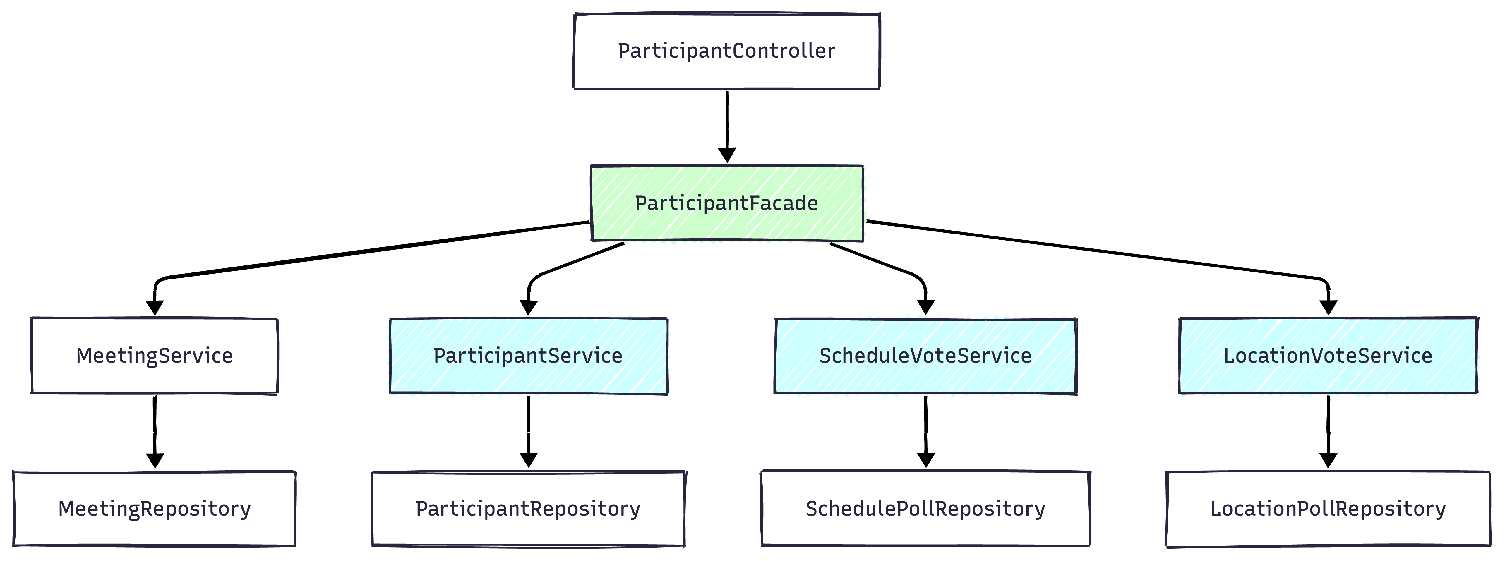 - Controller → Facade → (MeetingService + ParticipantService + VoteService들) → Repository 여러 개