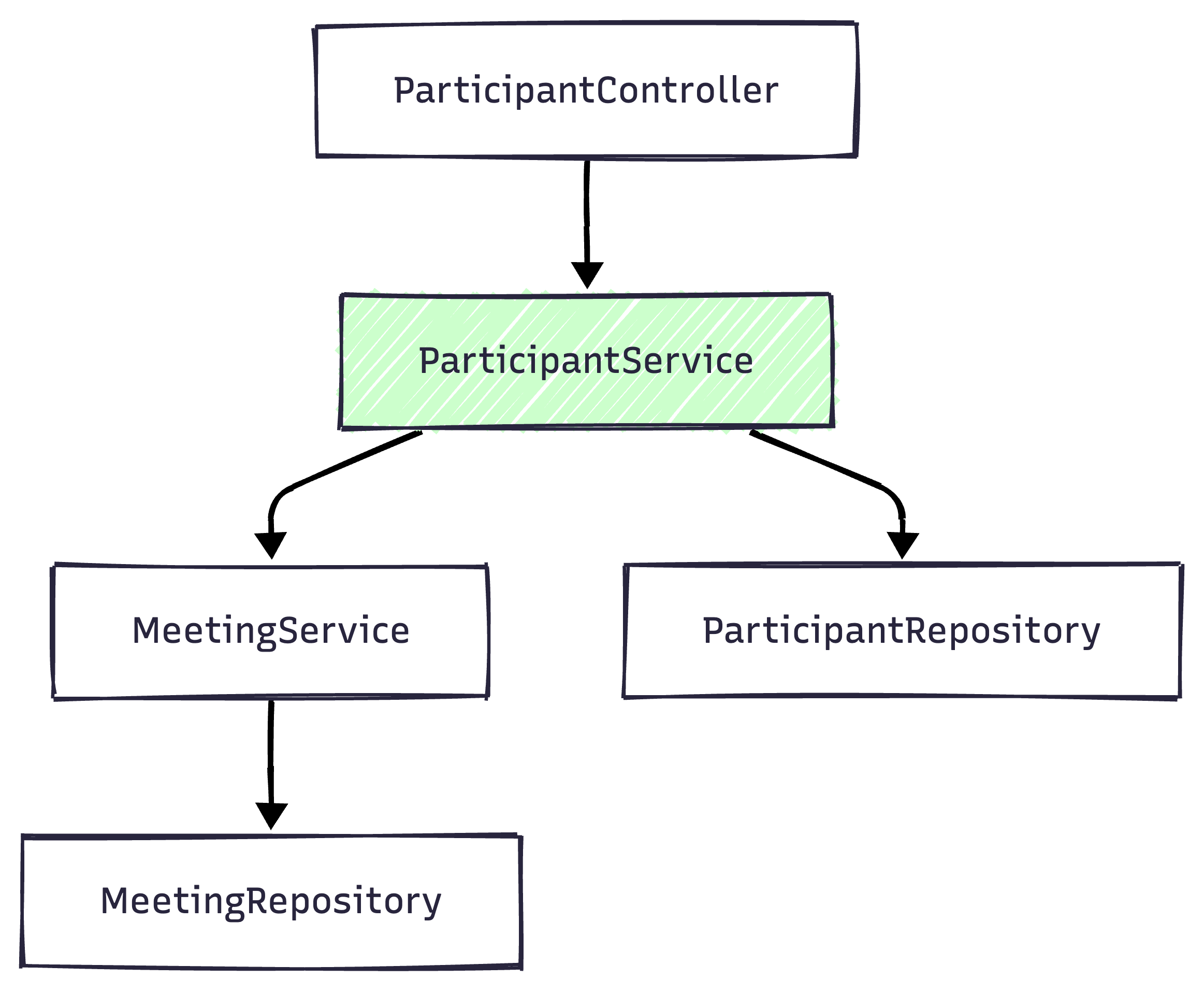 - Controller → ParticipantService → MeetingService + ParticipantRepository